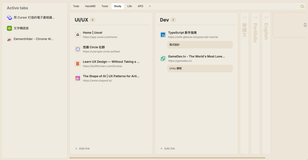實作的工具:文字轉語音的網站或 Extension、Tab 管理工具,都是我之前有付費訂閱過的產品,但現在都被實作出來了。