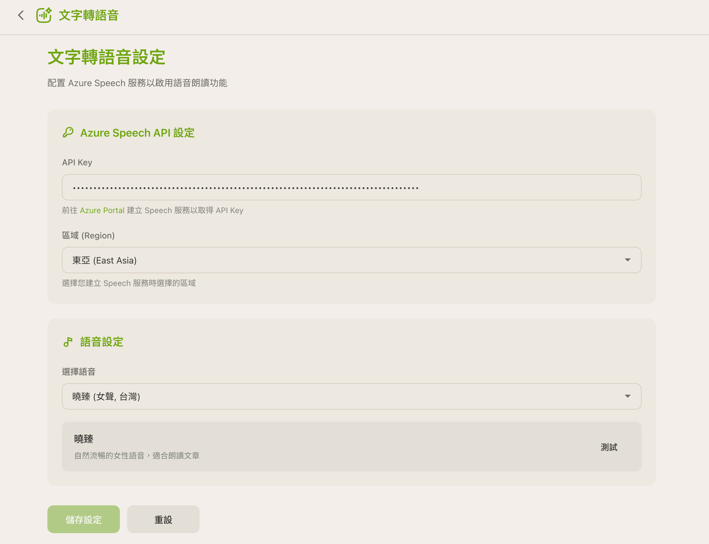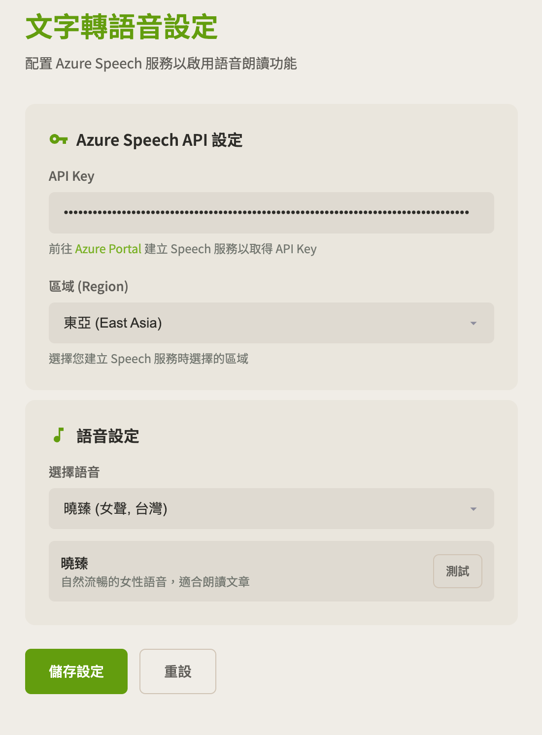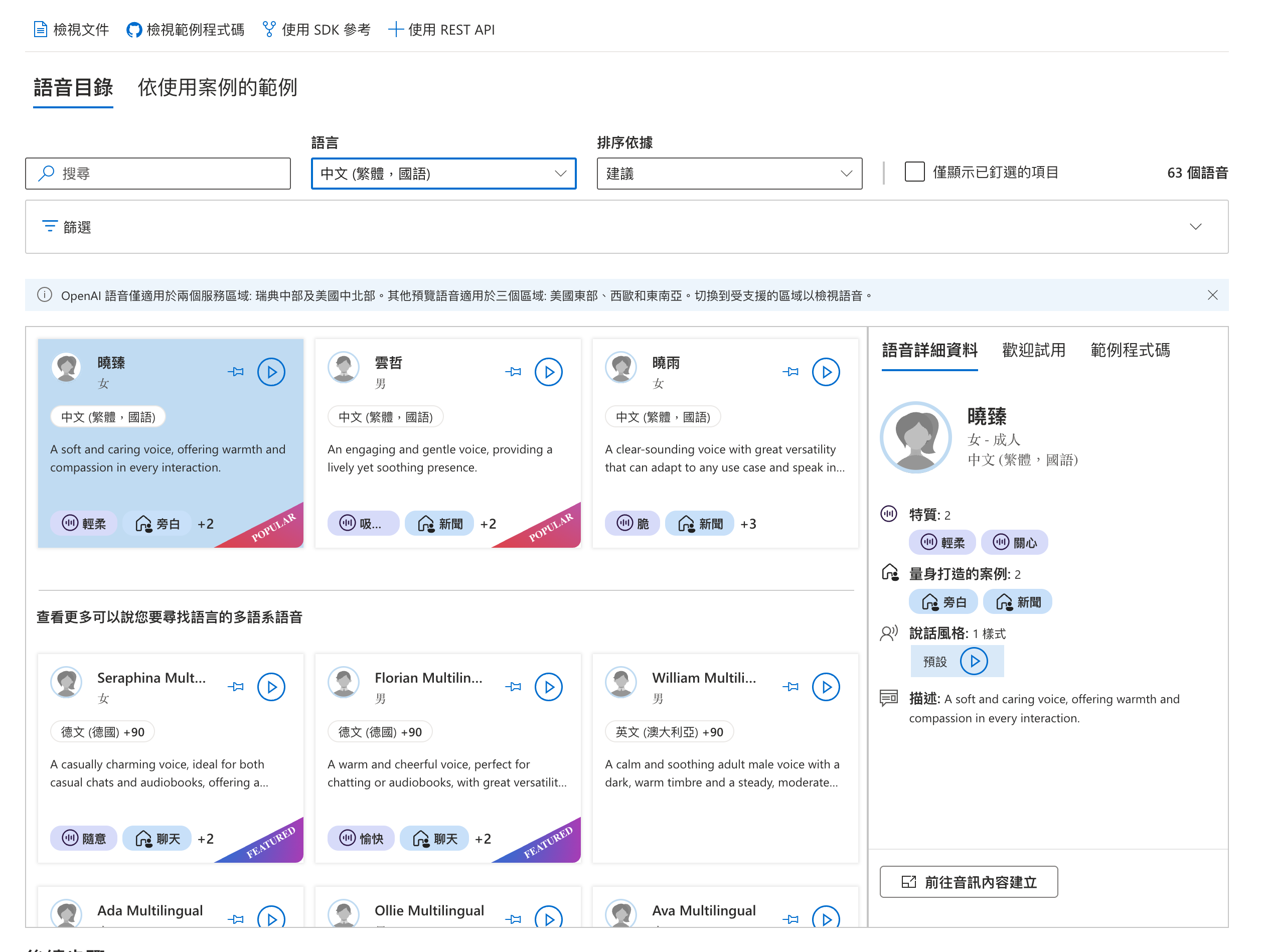 其中 Speechify 裡的某一個台灣女聲是我可以接受的,而 ElevenLabs 在他們平台從剛開始發展到最近、比較過聲音後,我都付費用過,但台灣的語音都不穩定或是有中國大陸的腔調,聽了不習慣。後來研究了一下,發現自己比較能接受的語音是來自 Azure Speech Studio 的語音,曉臻 (女聲, 台灣) – zh-TW-HsiaoChenNeural