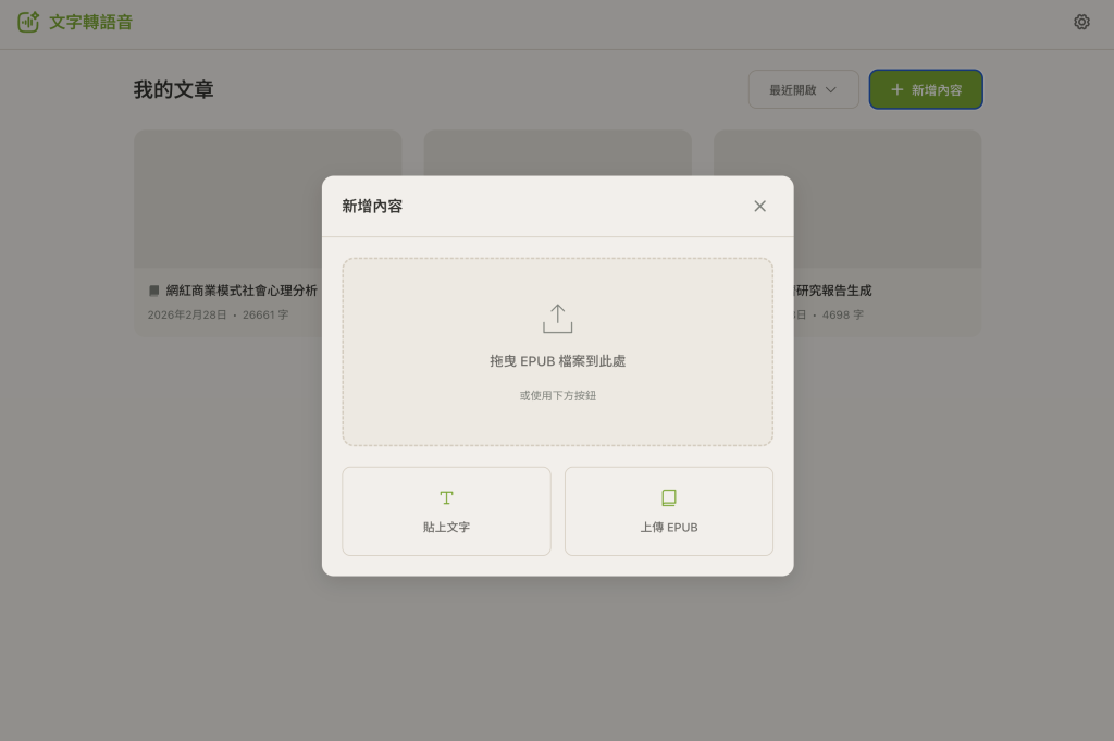 • 可以上傳 PDF、EPUB 或貼上文字等來源後,可以朗讀這些文字內容