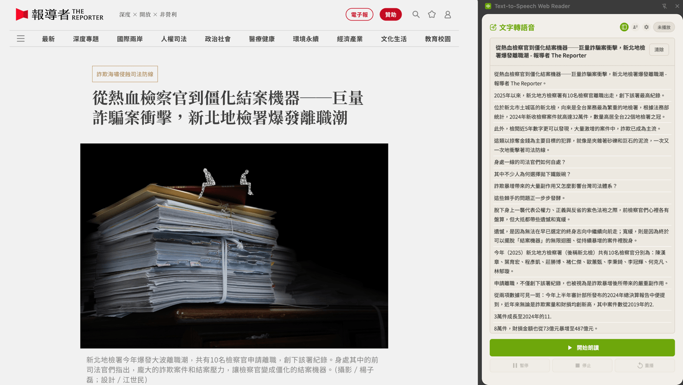 裝了這個 extension 後可以開啟側欄進行朗讀,在朗讀的過程中,也可以切換到不同頁面。
